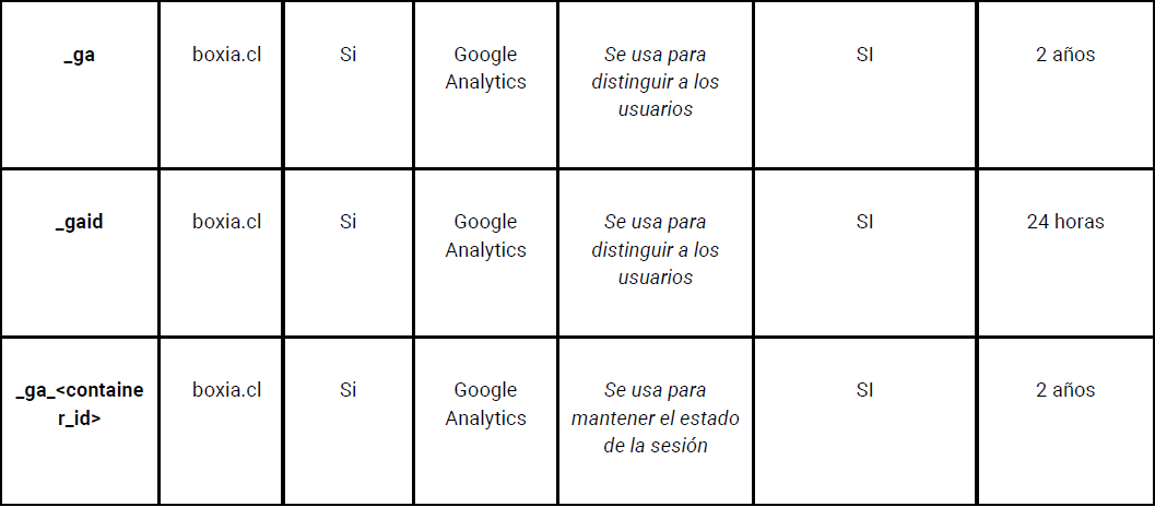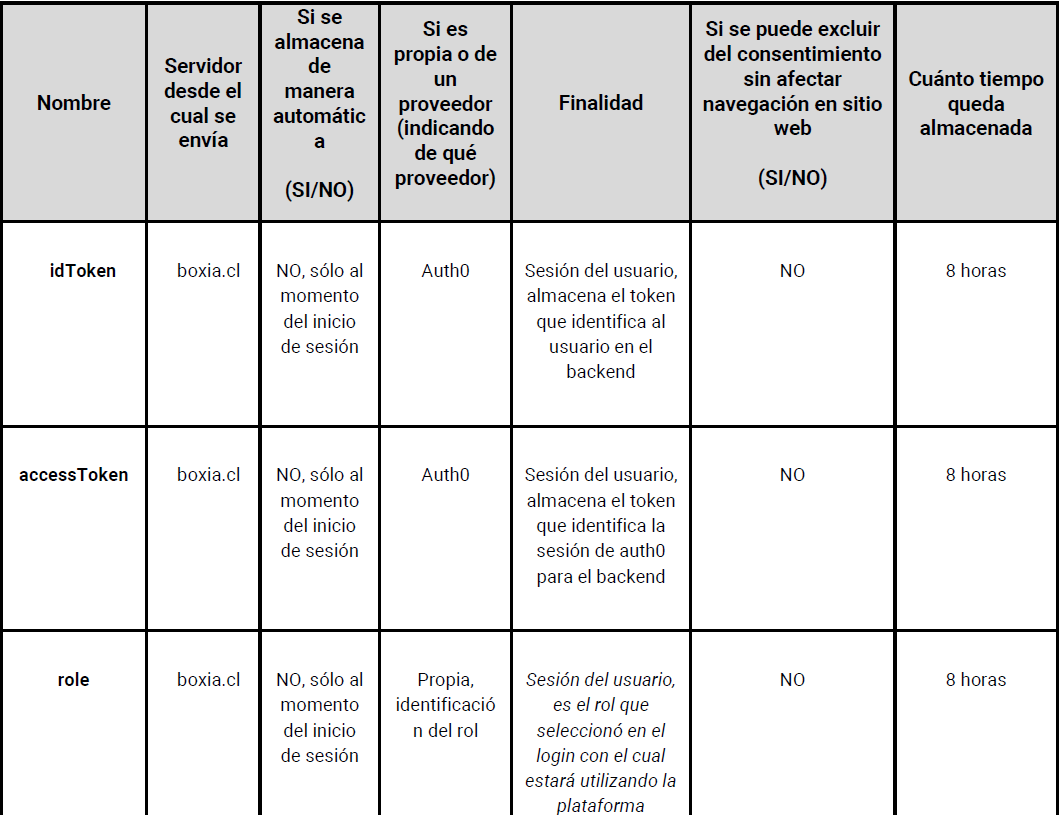 Las imágenes de la izquierda detalla las Cookies utilizadas en el Sitio y las características de cada una.